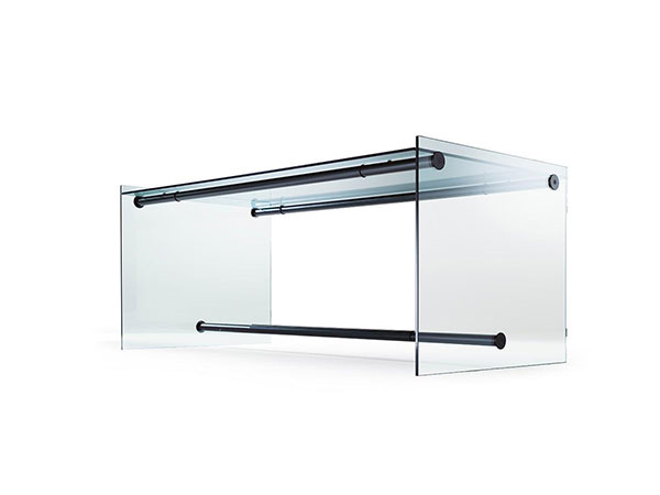 Desk with glass sides 12 mm thick and glass top 10 mm thick. Metal tubular supports black painted or in titanium finish.