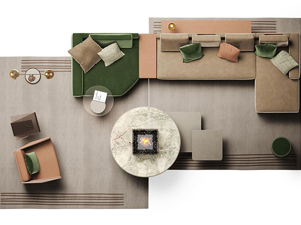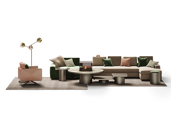 Modular sofa with wooden structure padded with polyurethane foam. Additional protecting coating in coupled fabric. Seat and back cushions in goose feather with polyurethane insert. Upholstery available in leather, velvet or fabric.