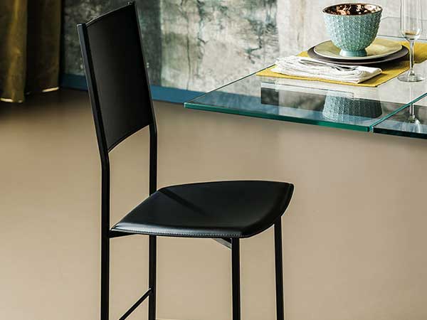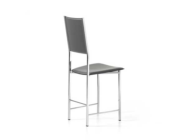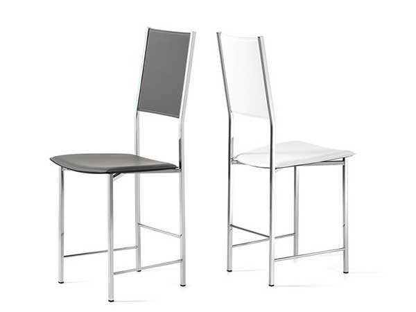 Chair with frame in chromed steel (08) or black chrome (06), black (OP17), white (OP71), graphite (OP69) painted steel. Back and seat in leather as per sample card. Standard stitching.