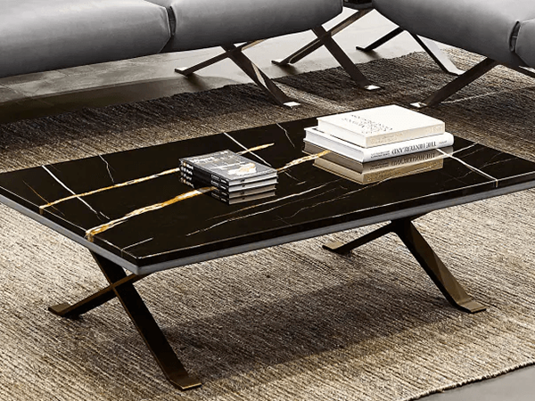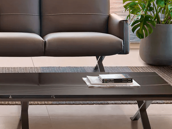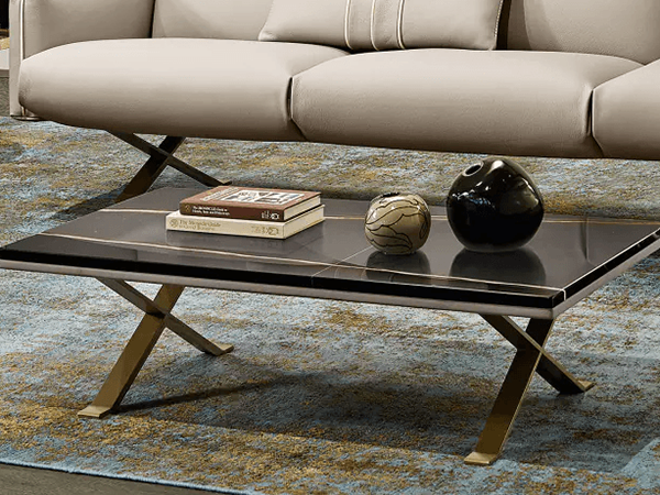 The Altoria coffee table makes a grand impression in a modern living room. The luxurious silhouette features x-shaped metal legs, leather accents in the center, and ceramic finishes on top. Because of these contrasting materials, this table stands out against one another for an eye-catching touch. There is plenty of room on top for an array of display opportunities. Pair with other pieces from the Rialto collection to form a cohesive design concept.