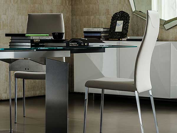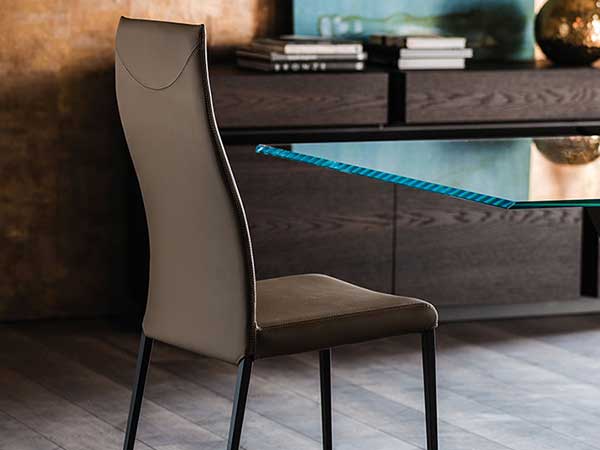 Chair with steel structure in chromed (08) or black chrome (06), white (OP71), black (OP17), graphite (OP69) or titanium (GFM11) finish, with or without arms. Removable cover in fabric or fix cover in soft leather, synthetic nubuck, micro nubuck or synthetic leather, as per sample card.