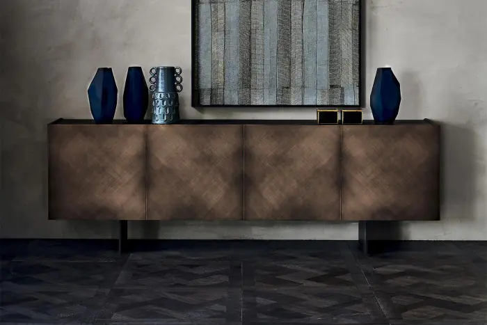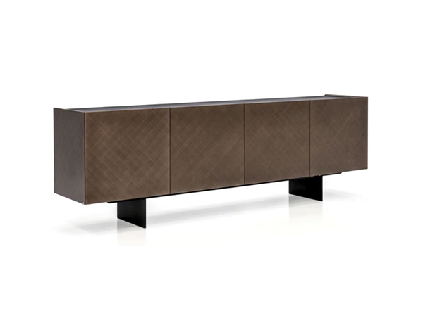 Thanks to the four spacious swing-door compartments and interior shelves, keeping items out-of-sight and organized is a breeze. There is also plenty of room on top to show off pieces of decor, memorabilia, and other items. Contrasting finishes on the top and base stand out against one another for a vibrant touch.
