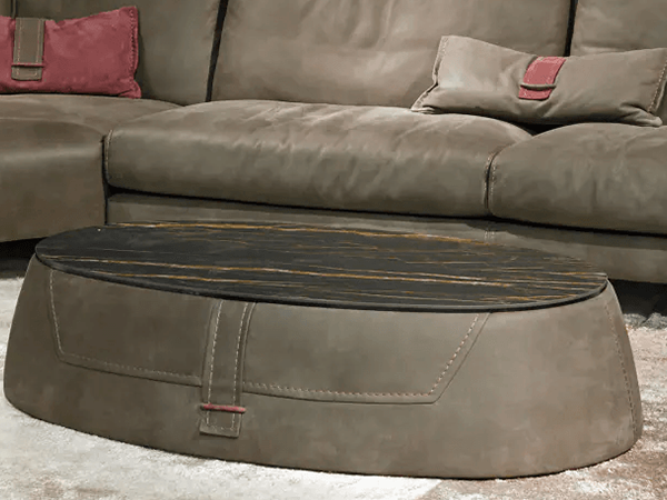 The Arle coffee table features an edgy silhouette and makes a statement in a contemporary living room. The unique barrel shape instantly elevates the style of the room, and the eye-catching leather buckle accent adds posh appeal. The juxtaposition between the top and base pop against one another and create a timeless effect. Part of the luxurious Karl collection that includes a sofa, the two look incredible together to form a beautiful composition.