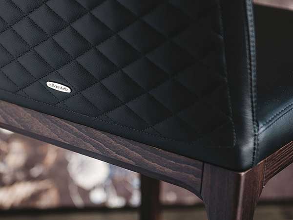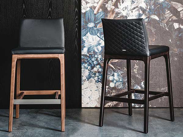 Stool with frame in natural beech (F1), Canaletto walnut (FNC), wenghè (FW), matt white (OP7) or black (OP17) stained beech. Cover in synthetic leather or soft leather as per sample card. Quilted seatback cover. The cover is not removable.