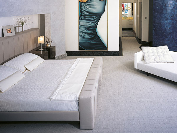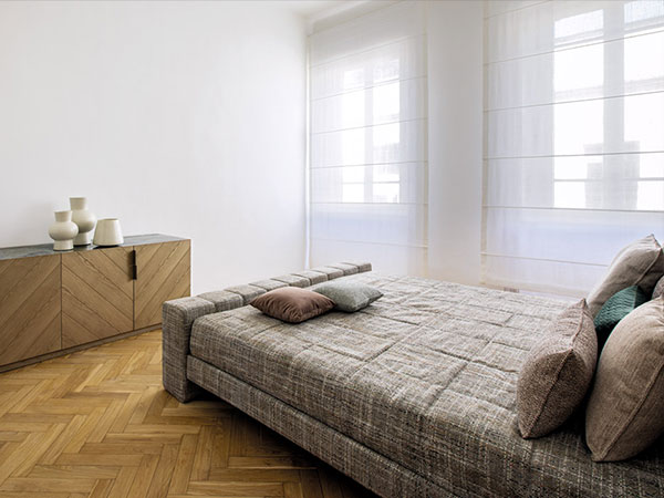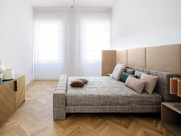 Upholstered bed with foot board, covered with fabrics and leather from our own collection.