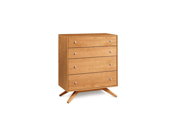 The Astrod 4 Bedroom is crafted in solid cherry hardwood and Made to Order in several finishes with a variety of knob or pull options. Astrod 4 dressers and chests feature soft-close, self close drawer glides. The Astrod 4 Bedroom is also crafted in a combination of solid walnut and dark chocolate maple. The finish is GREENGUARD Certified for low chemical emissions.