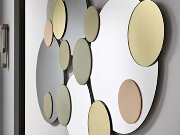 Wall mirror made of round elements in several dimensions in smoked, bronze, gold, pink and grey colour.