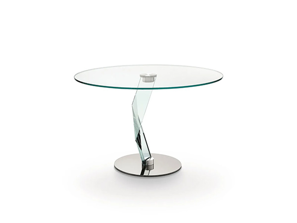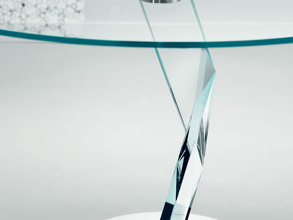 Balance is an extra clear glass dining table. The table top slab creates an elegant contrast with the two sculptured crystal elements that rest on the chrome-plated metal base.