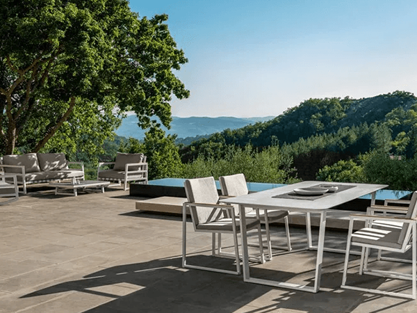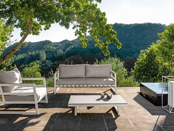 Bama sofa with a powder-coated aluminum frame in white or graphite. Sofa and seats are supported by polyester belts coordinated to the frame colour: light grey or dark grey. Cushions with removable covers, easy to wash and weather resistant. Quick dry foam padding.