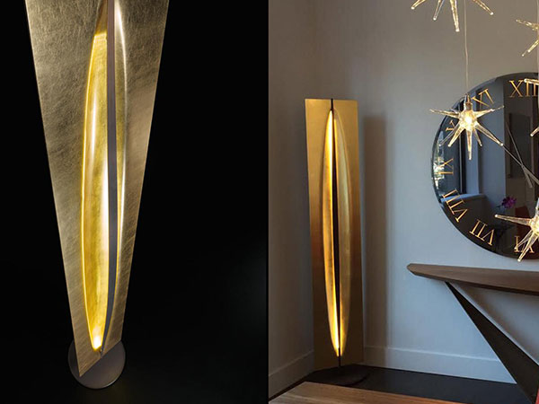 Floor lamp in extra clear curved glass 5 mm thick in gold leaf finish on swivel base in etched lacquered glass, creta colour. Metal support in brass finish. Vertical bar in burnished brass with LED STRIP