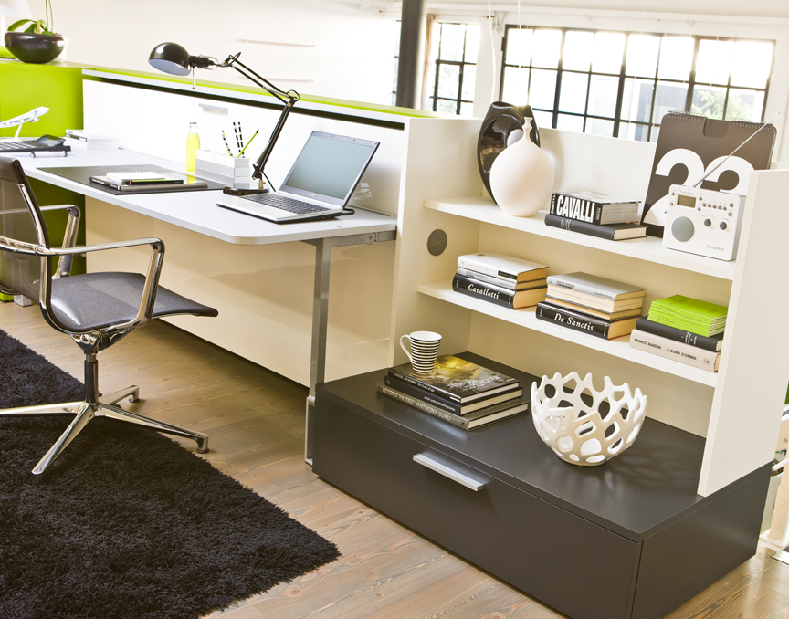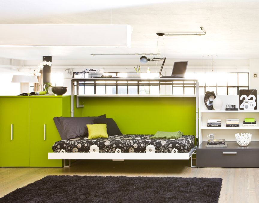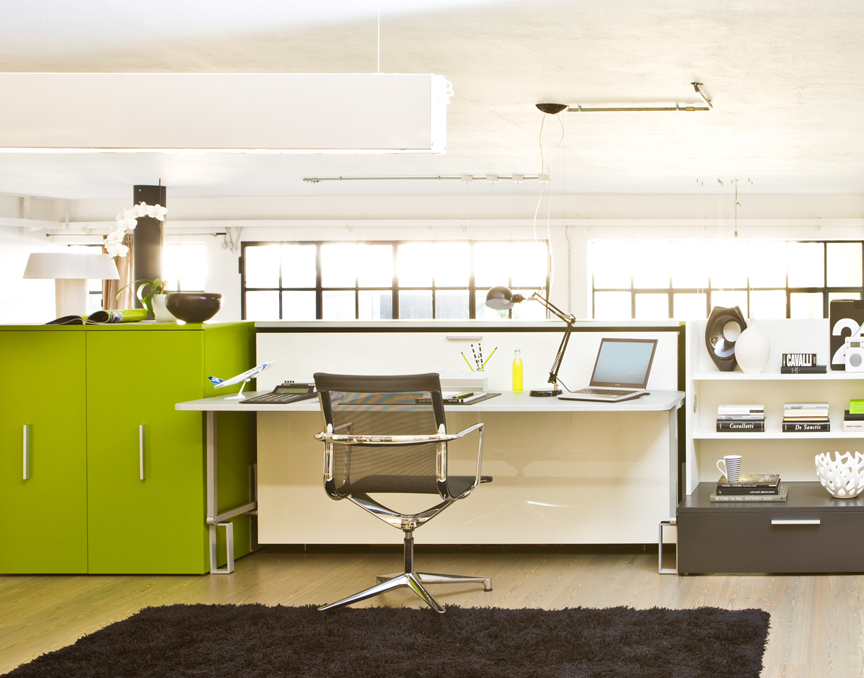 The Cabrio In is a horizontal wall bed with a desk – a 7′ desk and optional side storage or shelving. Many different color finishes are available with these convertible bed desks. Cabrio In is designed and made in Italy by Clei.