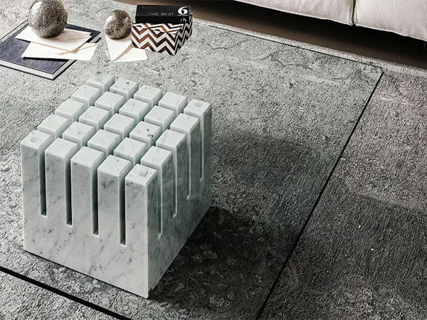The Caccose marble coffee table is dominated by the solidity of materials and richness of textures.