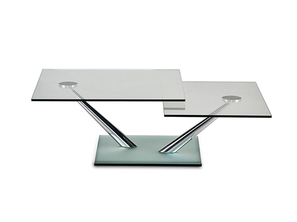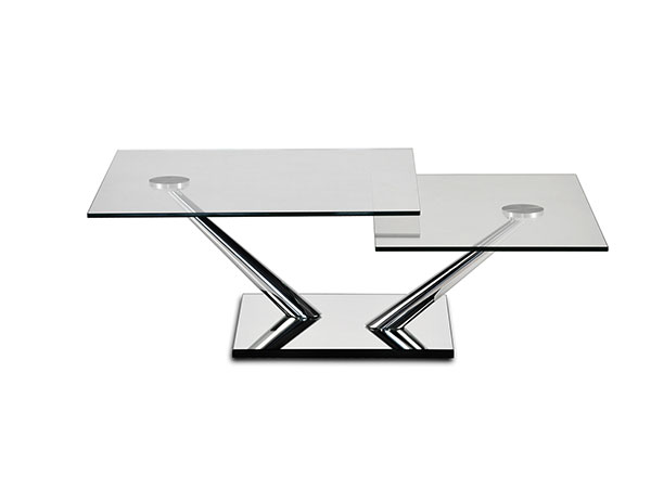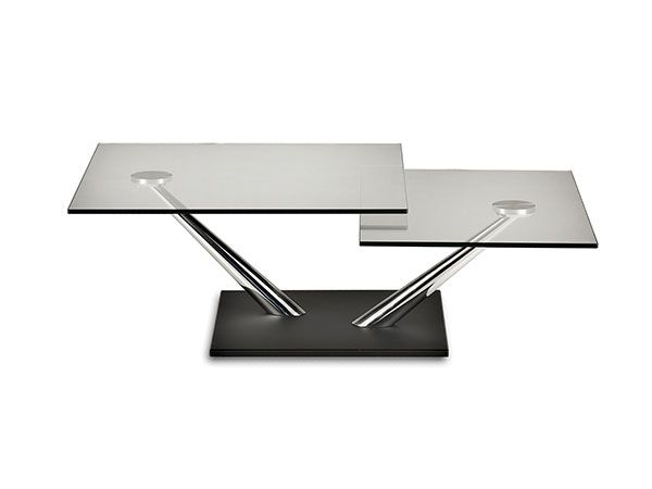 EXTENSIBLE COCKTAIL TABLE WITH SYNCHRONISED REVOLVING GLASS TOPS. BASE AND SUPPORTS IN GALVANISED OR PAINTED STEEL. AVAILABE ALSO WITH CERAMICS, PAINTED GLASS OR MIRROR BASE. AVAILABLE CERAMICS TOPS AND ONLY BIG TOP IN OAK.