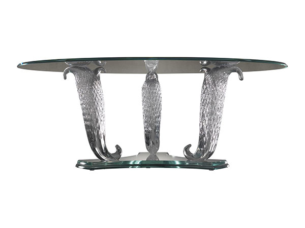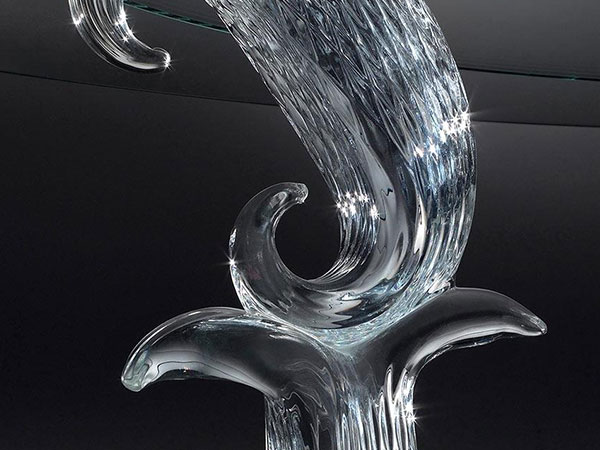 Coffee table with legs in transparent or pure gold Murano glass, handmade according to a traditional Venetian design, and a plinth in smoked mirror glass. Top in extra-clear glass 12 mm th. with 45° bevel.;