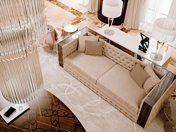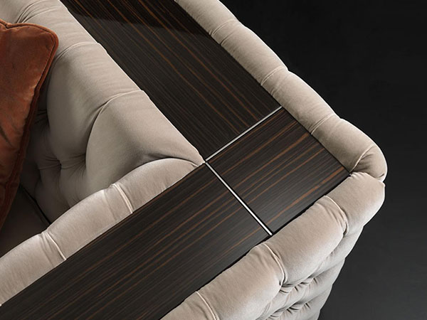 Upholstery in fabric, velvet or leather. Stud on backrest and arms, inside and outside.