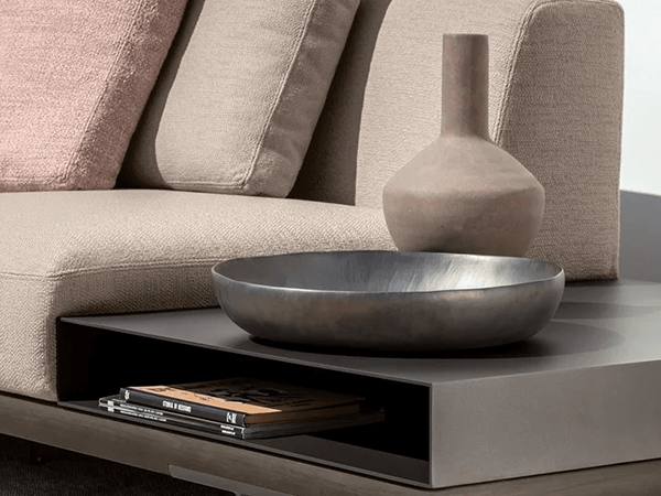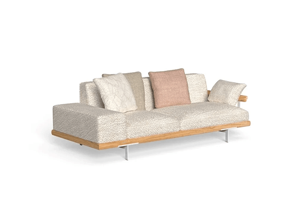 Ccoya 3 Seater is a two-seater outdoor sofa that combines elegance and informality. The peculiarity of this sofa is the customization of the armrests, which, thanks to the combination of the two versions available, gives the environment character and personality. The fabric-covered armrest, with its geometric design, provides strength and stability. The agile line of the armrest in wood and aluminum infuses lightness and refinement. Geometric and linear cushions, enriches with combinations and scenarios.