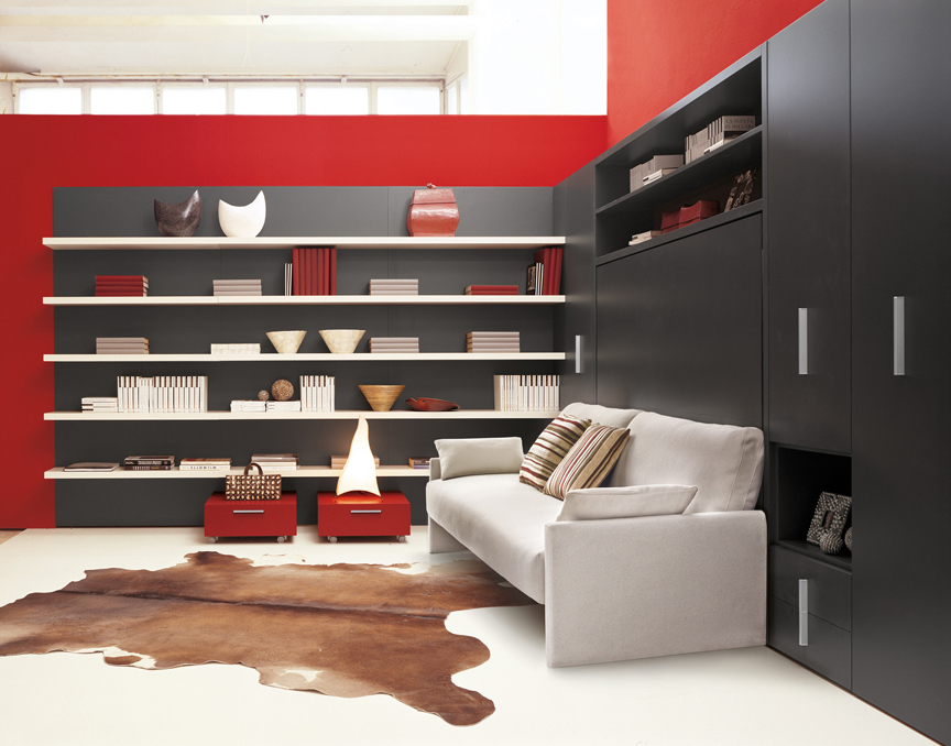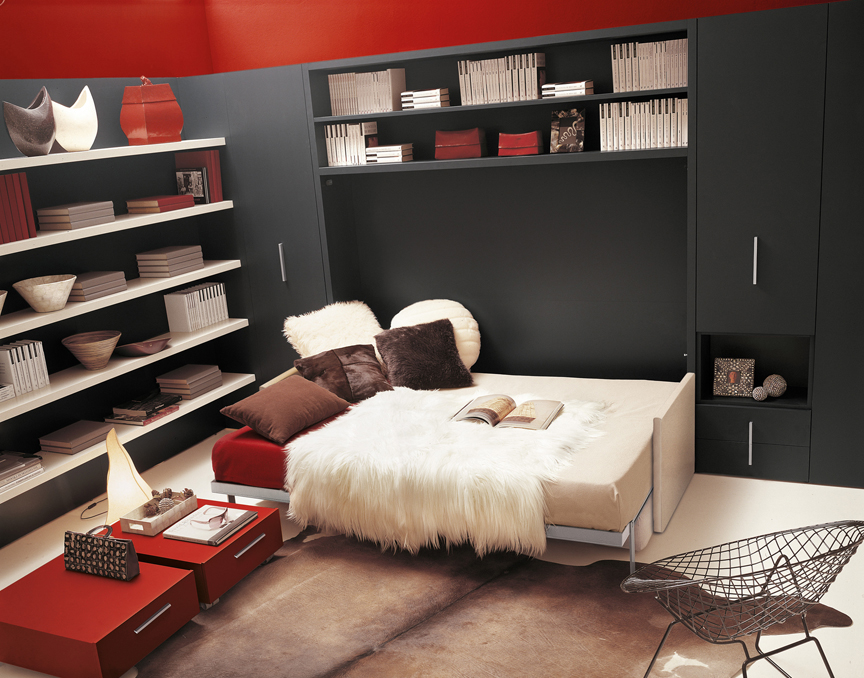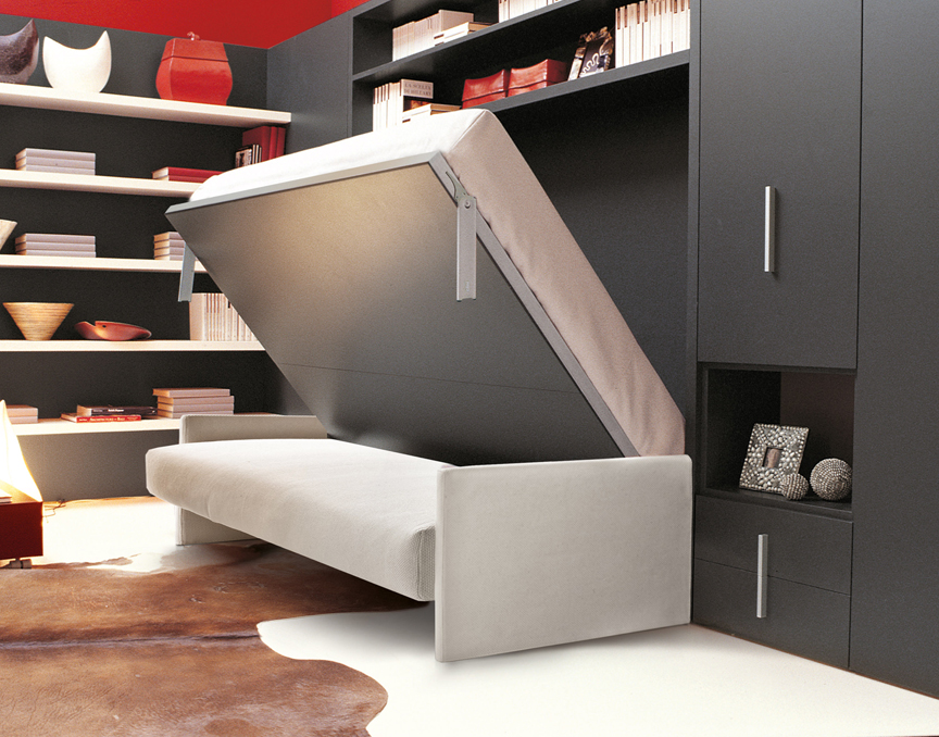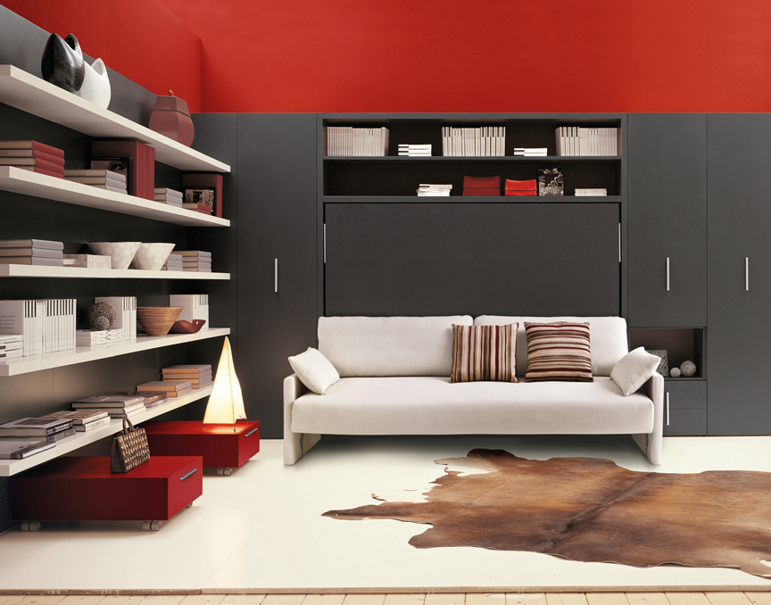 The Circe is a horizontally opening queen space saving bookshelf wall bed with two shelves above the bed that run the length of the unit. Many wall finish and sofa upholstery options available. The Circe wall bed unit is designed and made in Italy by Clei.