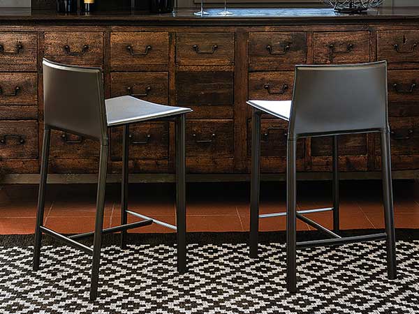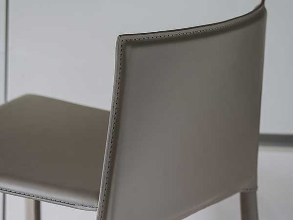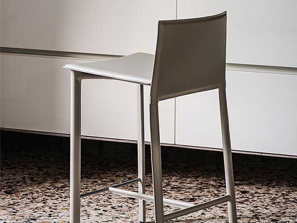 Stool with steel frame covered in leather as per sample card. Standard stitching.