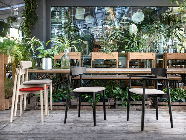 Parisian in character and drawing its inspiration from the traditional bistro chair, Clar appears as a slender, impeccably groomed seat. The design is simple yet sports essential details, such as the assertive way in which the turned legs join the backrest, which tilts out slightly towards the top to guarantee the utmost comfort. Stackable up to a height of five, it is also available with armrests and in a stool version.