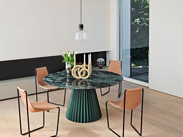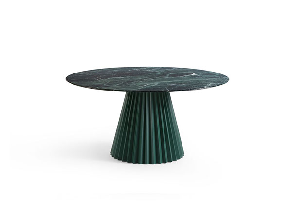 Fixed table with central lacquered metal base. Round top in veneered wood, crystalceramic and marble (ø180not available with crystalceramic top).