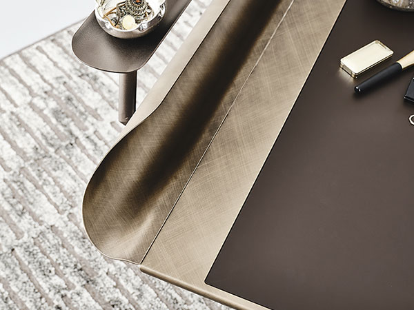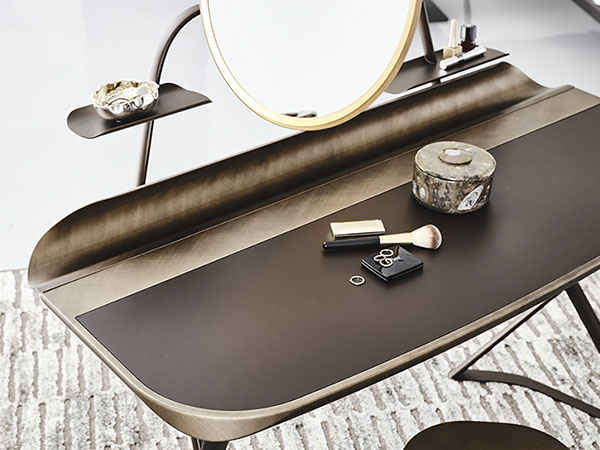 Dressing desk with base in titanium (GFM11), bronze (GFM18) or black (GFM73) embossed lacquered steel. Top in leather as per sample card with Brushed Bronze or Brushed Grey lacquered and rounded lower profile and grooved tray in Brushed Bronze or Brushed Grey lacquered steel. Mirror with frame in titanium (GFM11), bronze (GFM18), black (GFM73), Brushed bronze or Brushed Grey embossed lacquered steel with lateral supports and shelves in titanium (GFM11), bronze (GFM18) or black (GFM73) embossed lacquered steel. LED light.