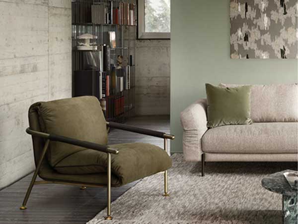 Its slender line, accentuated by the lightness of the structure, is a perfect example of modern elegance. The seat and back cushions, folded like petals, invite to an informal and relaxed position. Armrests covered with a cord in eco-leather.
