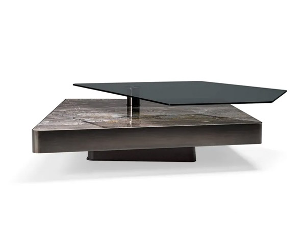 CUT is a high-end side table with sophisticated geometries. The elegant shape of the surfaces overlap in a play of textured layers where glass, marble and metal provide different heights.