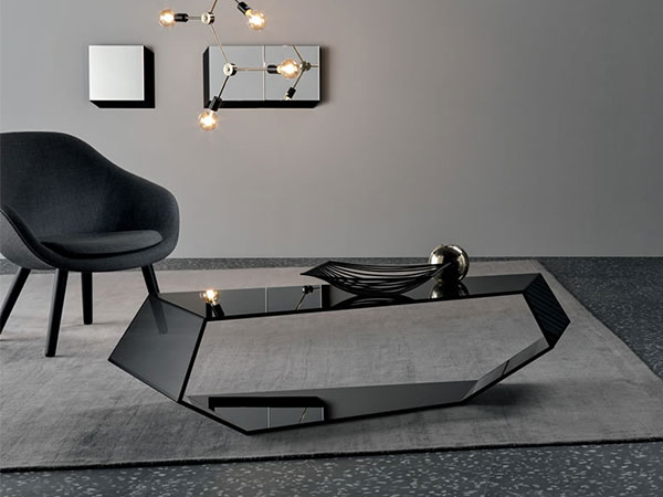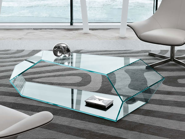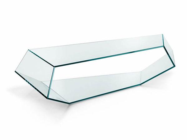 The particular angles of this low table produce a pleasant effect of continuity of the glass surface. Can be placed directly on floor or lift up on feet (included).