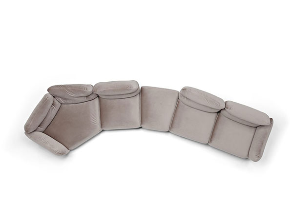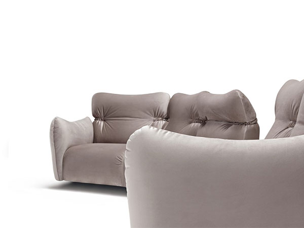 Rounded contours and exclusive details in the carefully crafted covering, including the double drapery interrupting the linear profile of the backrest, make for a truly distinctive sofa with a dynamic and contemporary feel.