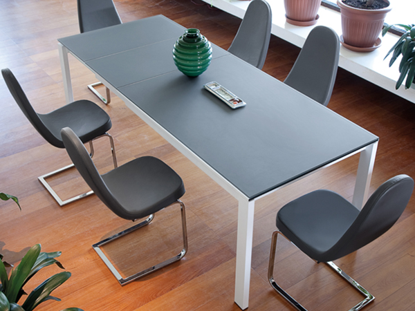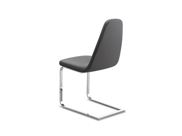 A sleek contemporary dining chair with a chromed steel or matt anthracite frame. The seat is padded and upholstered in gray or taupe leatherette (15% polyester, 85% PVC) – gray is the darker of the two shades shown.