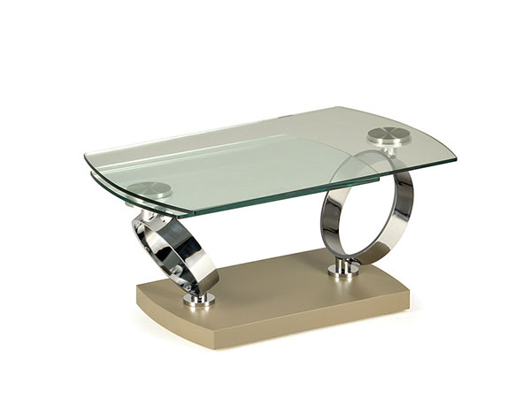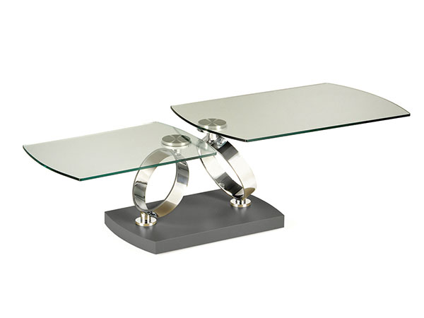 EXTENSIBLE COCKTAIL TABLE WITH SYNCHRONISED REVOLVING GLASS TOPS. WOODEN BASE IN AND SUPPORTS IN PAINTED OR GALVANISED STEEL.