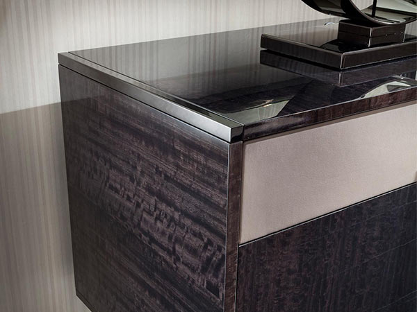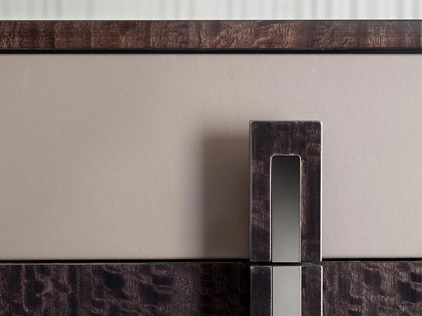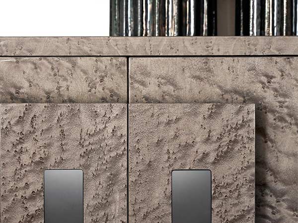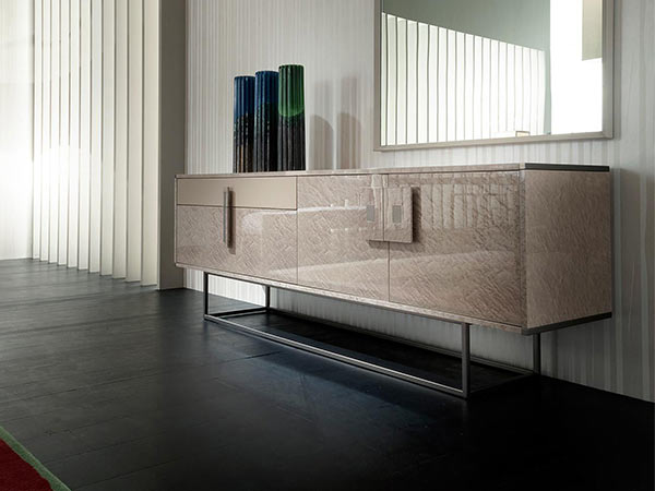 Dracco buffet is an ideal storage solution that makes a statement piece in a modern home. The flap door opens easily with an internal shelf and lots of room inside to make organization a breeze and the drawer is a convenient feature. Different textures and materials stand out against one another for a complementary feature. With door handles that jut out, opposing levels are created for a pleasing aesthetic. The luxury inlay top manipulates the grain of the wood to showcase different directions for a striking element.