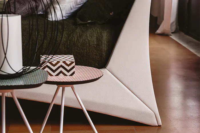 It is without a doubt by selecting this product you are opting to express a distinctive character that echoes modern scale, silhouette, and colors. The Dynamic bed stands on four feet that are cleverly positioned away from the naked eye, purposely creating a “floating” effect. Available in queen, king, and California king sizes, Dynamic features upholstery options that include eco leathers, soft leathers, soft leather glove, fabrics, micro, and eco nabuk in a multitude of colors.