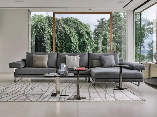 Carved, geometric lines give it great personality and a unique style combined with maximum comfort. Oversize seat, back and armrests are extremely soft for all round cosiness. Egall is the latest elaboration of the 1980s concept of the sofa. The feet, available in chromed or micaceous brown stained metal, support the wide armrests in down.