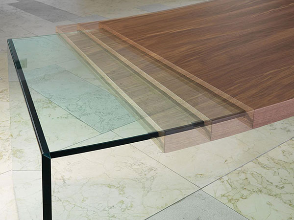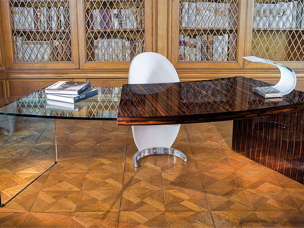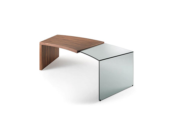 Desk with extensible wooden top and glass side 19 mm thick. Finishing: Canaletto walnut, shiny ebony, matt lacquered