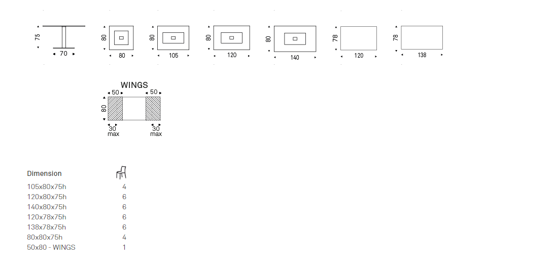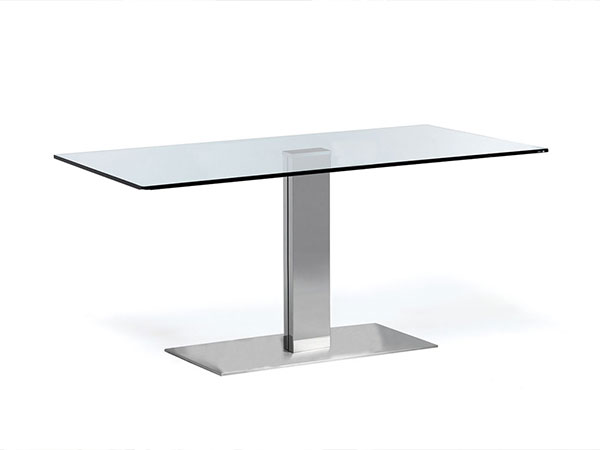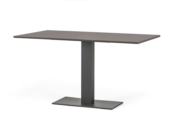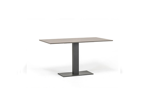 Table with base in white (GFM71), graphite (GFM69) embossed lacquered steel or with satin stainless steel anti-marks base and polished stainless steel column. Top in 15mm clear glass, grey London Fenix (LM21) or castoro Ottawa Fenix (LM22) laminated wood. Optional: stainless steel extensions only for glass top.