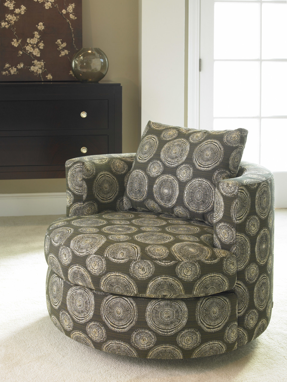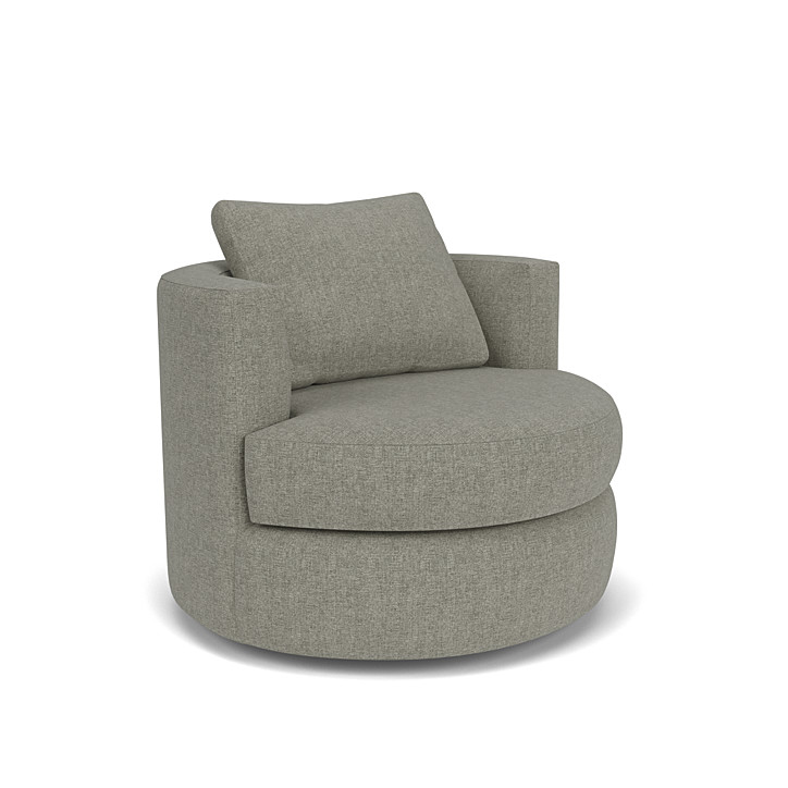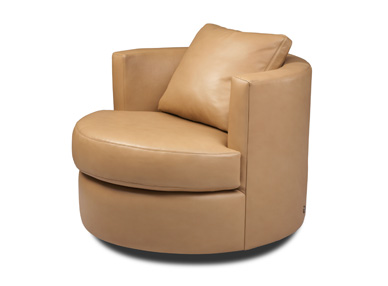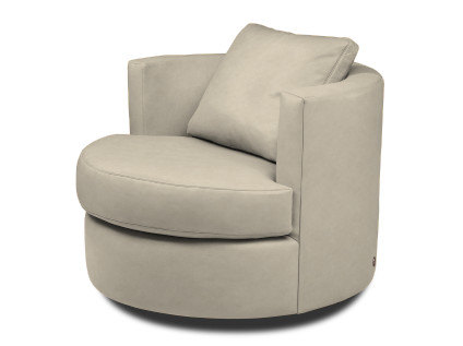 This small-scale swivel chair with a half-circle back and a loose back cushion proves nearly irresistible, thanks to its seating comfort and curvaceous good looks.The memory swivel returns the chair to center. An ideal addition for conversations, parties and everyday relaxation. Options include an extra firm seat, a down seat and contrasting seat and back.