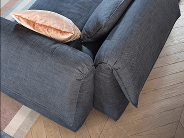 Emmefule is a modular sofa with a high backrest and a comfortable seat, characterized by its soft, enveloping shape. Its original design allows for maximum freedom of customization with its three elements: the back and arm rests can be positioned in a variety of ways, making Emmefule a playful and extremely versatile system. With the back and arm rests raised, it is a snug and familiar sofa. The back and arm rests can also be reclined outwards through a special “swivel” device, a quick and fluid movement achieved with a simple motion of the hand. Fully removable covers.