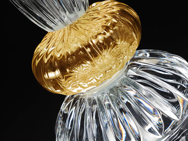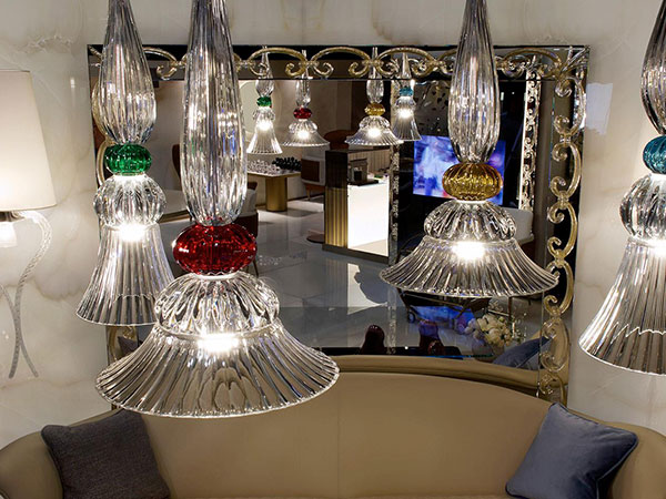 Suspension lamps composed by elements in engraved transparent crystal with coloured detail in amber, red, blue, green or acquamarine.