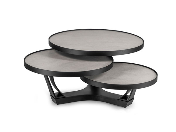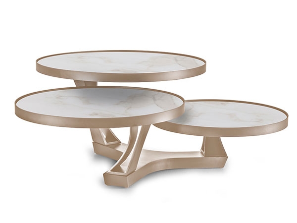 EXTENSIBLE COFFEE TABLE WITH 3 CERAMIC TOPS . EQUIPPED WITH AN INNOVATIVE SYNCHRONIZED MECHANISM THAT ALLO W THE 3 TOPS TO BE OPENED AT ONCE, WITH A SIMPLE GESTURE AND BE AT THE SAME TIME PLACE D IN DIFFERENT DIRECTIONS. SUPPORTS IN PAINTE D STEEL.