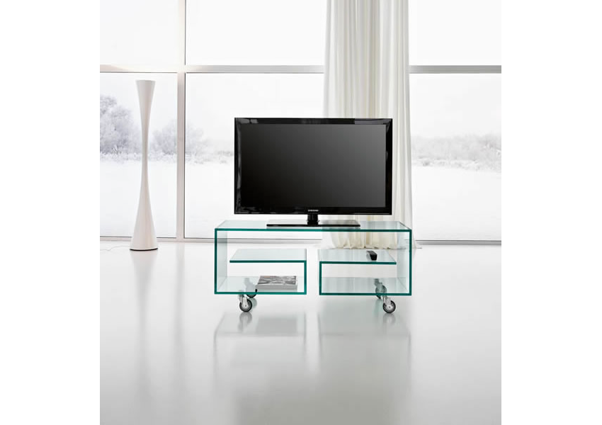 Glass TV unit. Very practical thanks to the movement on castors and shelves.