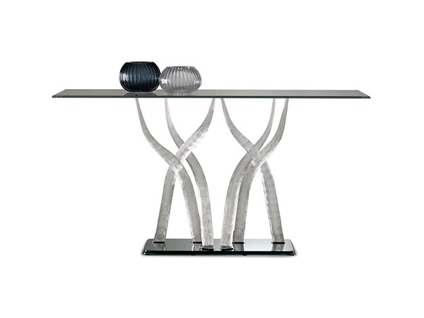 Console. Base in transparent or pure gold Murano glass elements and plinth in smoked mirror glass. Top in extra clear transparent glass 12 mm thick with 45° bevel.;