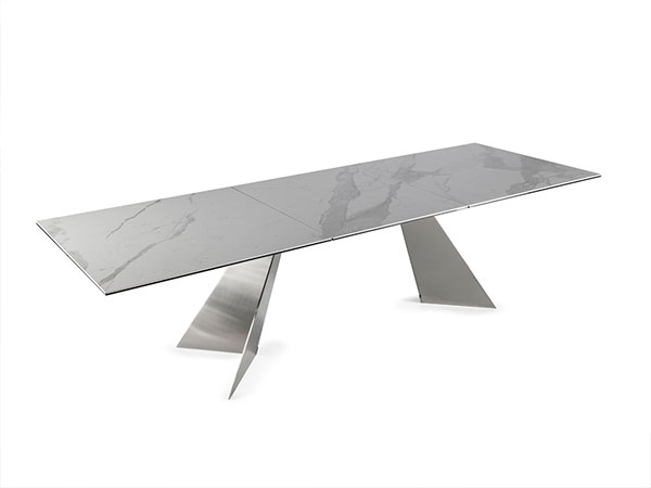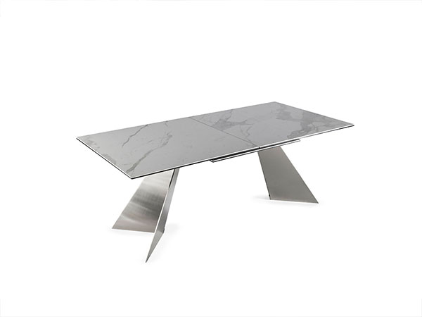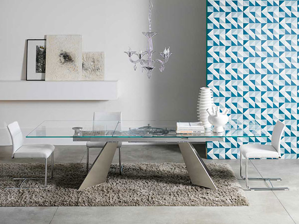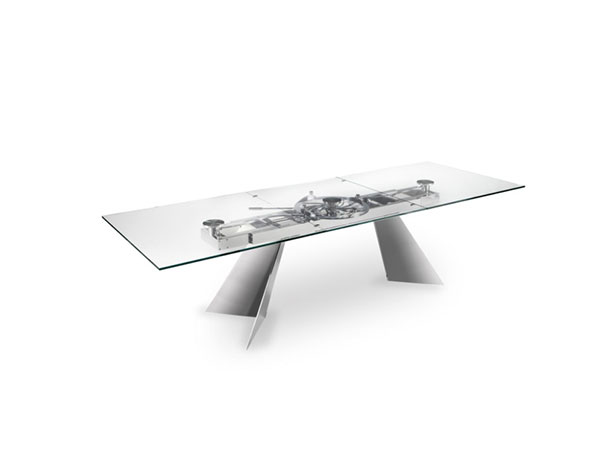 This unique product features a glass top with an extension mechanism in the center that works by simply pulling the discreet lever under the table, creating more space in seconds. As it’s opening, you can see the metal wheel in the center, turning as it extends the table.