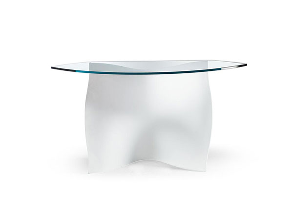 Console with base in curved glass, extraclear, bronze or smoke-grey with sandblasted finish. Available also in sandblasted and lacquered glass. Glass top 12 mm thick.