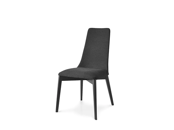 This is perfect for dining rooms, especially in a home with a stylish look. The seat is characterized by a thin, rounded outline with soft yet clear lines. It is extremely comfortable thanks to the shaped shell made from cold-foamed polyurethane, a material that maintains its features over time. The fabric upholstery, bonded onto the shell, perfectly adheres to the model silhouette. The wooden legs are a perfect match for tables in the same material.