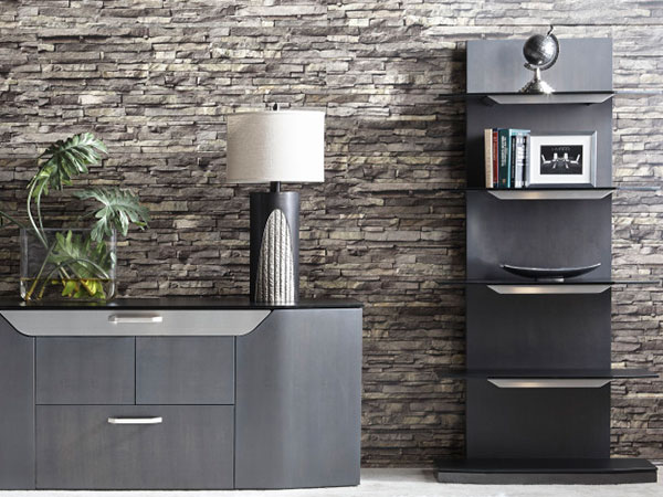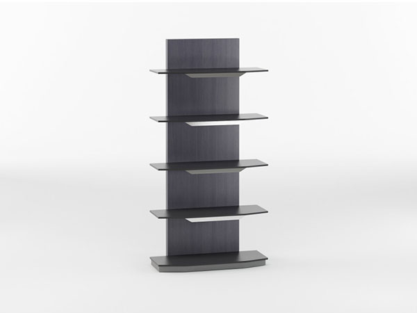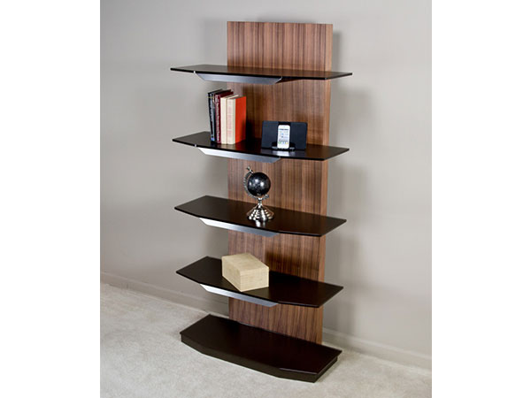 The unique cantilevered structure of the Heaven bookcase makes the shelves appear to float! No need to worry— the tempered glass shelves are actually anchored to the structure with generous stainless steel billets for stability and safety. Heavy steel construction ensures that this bookcase is a workhorse as well as a true beauty. The flattened arch theme of the Heaven family is apparent, from the profile of the Sable/Caviar glass shelves to the sleek champagne-plated accent panels. Rich walnut veneer wraps the entire upright support panel, providing warmth and also allowing this unit to be used either against a wall or as a freestanding etagere. When combined with the Heaven desk, Heaven file cart & credenza, the Heaven bookcase completes a truly stunning workplace ensemble. The Heaven bookcase is available in any Elite powder-coat finish, with either Sable or Caviar etched glass. Walnut veneer components available in a variety of finishes. Companion file cart, bookcase, and buffet also available.