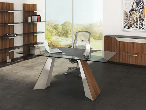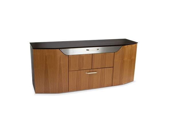 The sleek and functional Heaven credenza brings style and storage to your workplace, along with a rich palette of materials. The flattened arch theme of our popular Heaven family is apparent here, from the Sable or Caviar glass top and unique front profile to the dramatic champagne-plated utility drawer— and even the handles! This striking credenza provides two generous storage cabinets, each with a contoured walnut veneer door and an adjustable tempered clear glass shelf. There’s also a legal/letter file drawer and two touch-latch doors, all in walnut veneer, concealing a pull-out printer tray and paper storage. The generous top utility drawer can also hold a charging station for any and all your portable electronic devices. Combined the Heaven bookcase, file cart and Heaven desk, with the Heaven credenza to create a truly striking workplace ensemble. The Haven credenza is available in any Elite powder-coat finish, with either Sable or Caviar etched tempered glass. Walnut veneer components are available in a variety of finishes. Companion file cart, bookcase, and buffet also available.