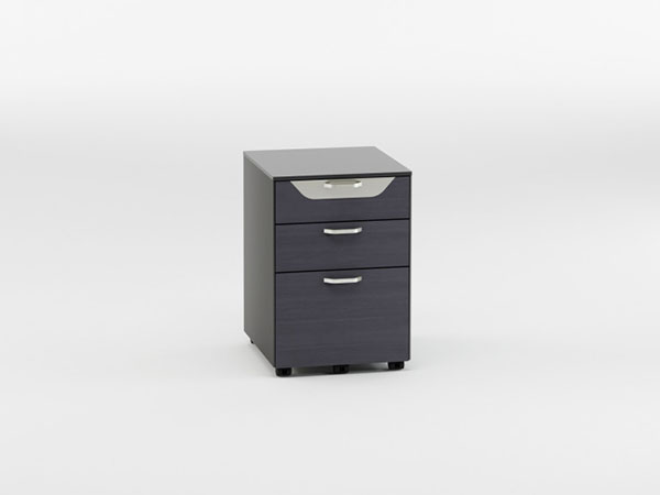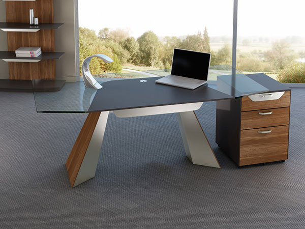 The primal yet contemporary form of our popular Heaven collection is the central motif of this chic yet practical work environment. Fashion meets functionality in this striking system, ideal for your home office or your corner office. All your power access and wire management needs are addressed— we’ve included a prewired power strip with surge protector, phone line, and cable hookup. Just open the magnetically-latched fold-down access panel, make your connections, and simply close the panel— no tools needed. You can run all your cables through the access grommet on the generous desktop, which features a dynamic inset Sable or Caviar acid-etched glass “blotter” which reinforces the flattened arch theme while concealing a champagne-fronted keyboard tray/pencil drawer. The dynamic arched body, clad in stainless steel panels and rich walnut veneer, artfully conceals all wiring and connectors. There’s also a rolling file cart, which mimics the flattened arch desk top with contrasting stainless and walnut drawer fronts and handles. Add the companion credenza and bookcase to complete the most stunning workplace ensemble available today. Haven desk and Haven file cart, credenza, and bookcase are available in any Elite powder-coat finish, with either Sable or Caviar etched tempered glass. Walnut veneer components are available in a variety of finishes. Heaven credenza, bookcase, and buffet also available.