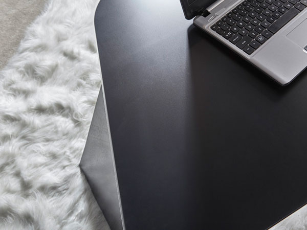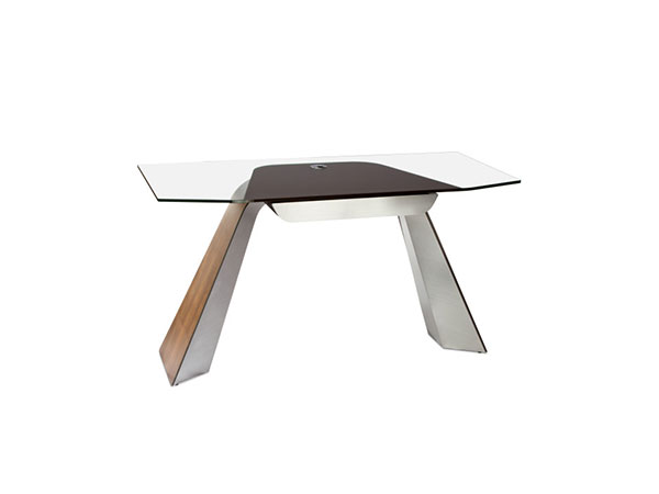 We’ve taken all the fashion and functionality of our popular Heaven desk and resized it to fit in a variety of more compact spaces. All your power access and wire management needs are addressed— we’ve included a prewired power strip with surge protector and USB power outlets. Just open the magnetically-latched fold-down access panel, make your connections, and simply close the panel— no tools needed! You can run all your cables through the access grommet on the rescaled desktop, which features a dynamic inset Sable/Caviar glass “blotter” which reinforces the flattened arch theme while concealing a champagne-fronted keyboard tray/pencil drawer. The dynamic arched body, clad in stainless steel panels and rich walnut veneer, artfully conceals all wiring and connectors. The Heaven laptop desk is available with either Sable or Caviar etched insert in the tempered glass top, and the walnut veneer body is available in a variety of finishes. Heaven credenza, file cart, bookcase, and buffet also available.