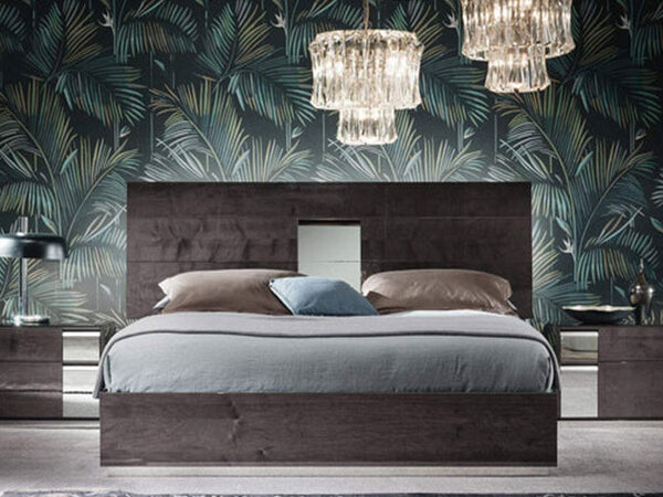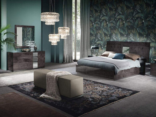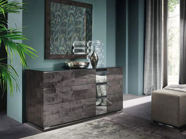 The case goods; nightstands, dresser, and tall chest feature a unique anthracite-toned glass. Case Goods also feature soft closing mechanisms.